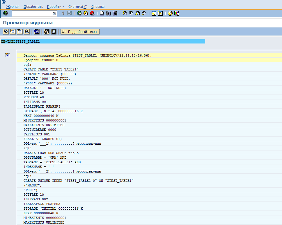 Рис. 7. Журнал создания таблицы в базе данных.