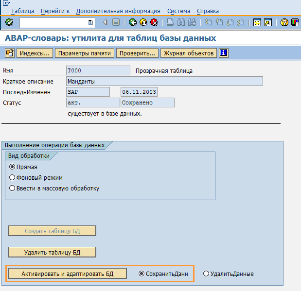 Часто эта транзакция помогает в решении проблем с таблицей, когда необходимо пересоздать таблицу в базе данных. В этом случае следует выбрать пункт меню "Активировать и адаптировать БД" с обязательным указанием пункта "Сохранить данные" (Рис. 8).